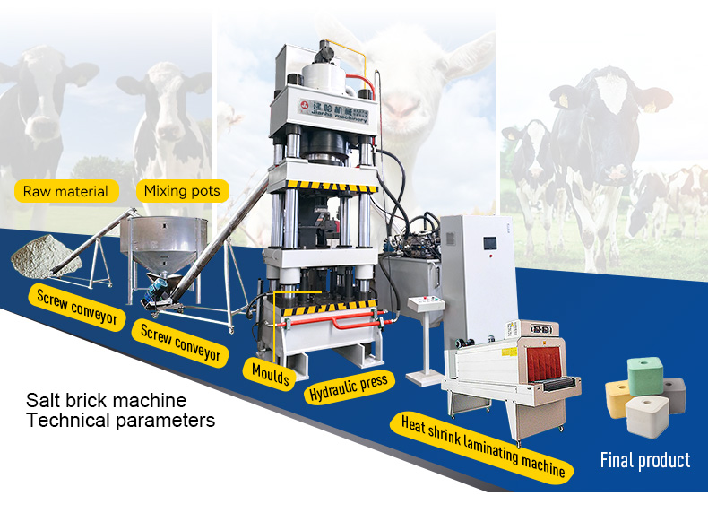 The hydraulic press used for producing animal salt bricks is a powder molding hydraulic press specifically designed for livesstock salt bricks(lick bricks).